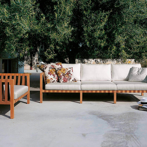 Mistral è il divano modulare per esterni progettato da Rodolfo Dordoni per Roda, sintesi perfetta di essenzialità formale e intelligenza progettuale. La struttura in teak massello, arricchita da dettagli in acciaio verniciato e da corde intrecciate in poliestere, restituisce leggerezza visiva e solidità architettonica.